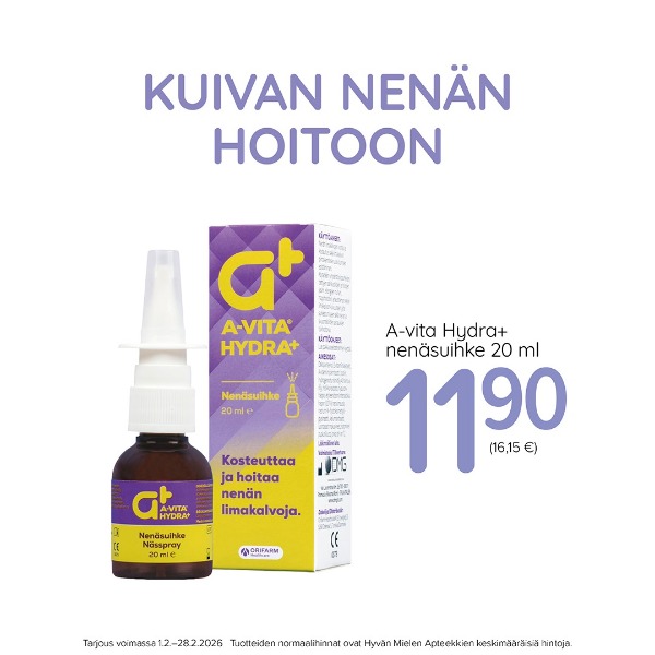 Hyaluronihappoa sisältävä A-Vita Hydra+ -nenäsuihke voitelee ja kosteuttaa nenän limakalvot pitäen ne joustavina. Käytetään nenän limakalvojen kuivumisen tai surkastumisen ehkäisyyn sekä nenän ja sivuonteloiden sairauksien tukihoitoon.