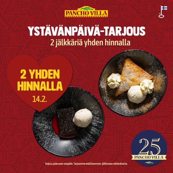 Miltä kuulostaa ystävänpäivän herkut Panchosta? Ystävänpäivänä tarjoamme kaksi jälkkäriä yhden hinnalla!♥ Etu voimassa vain ystävänpäivänä 14.2 Tervetuloa!☺