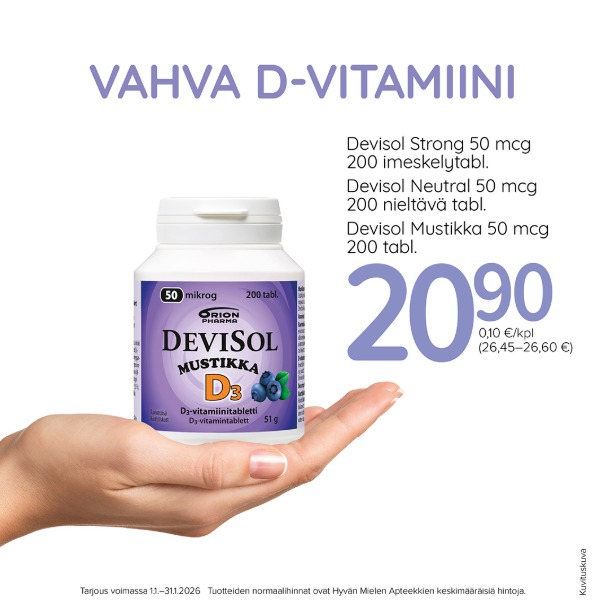 Vahvat 50mcg sisältävät ja hyvin imeytyvät Devisol D3-vitamiinit ylläpitävät vastustuskykyäsi. Vaihtoehtoina nieltävä tai puru-/imeskelytabletti.