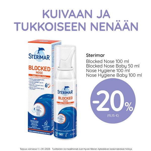 Pohjana Sterimar-valmisteissa on 100% luonnollinen merivesi. Sterimar-tuotteista löytyy nenäsuihke jokaiselle ikäryhmälle ja tarpeeseen. Ne puhdistavat, kosteuttavat ja helpottavat tukkoista oloa.