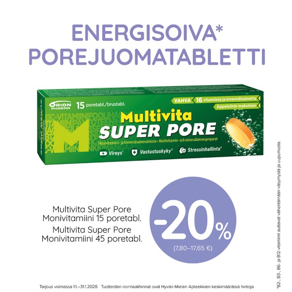 Appelsiinin makuinen, energisoiva ja vahva porejuomatabletti, joka sisältää erityisen runsaasti kaikkia päivittäin tarvittavia B-vitamiineja sekä C-ja D-vitamiinia. Hyvänmakuisen porejuoman sisältämät vitamiinit ja kivennäisaineet auttavat jaksamaan!